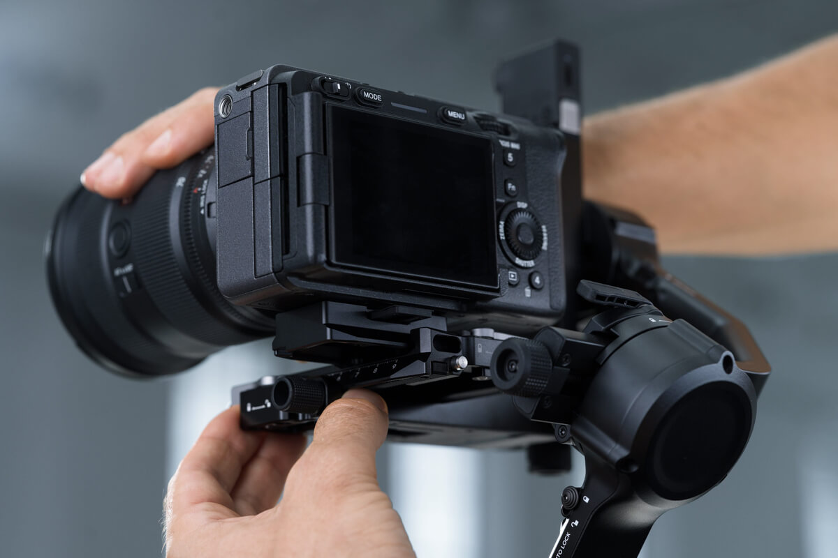Die obere Schnellwechselplatte verfügt über eine verstellbare Platzierungsführung, die bündig an der Unterseite der Kamera anliegt und als Stopper dient. Selbst bei der Verwendung nur einer einzelnen 1/4″ Schraube bleibt die Kamera sicher fixiert. Dies gewährleistet stabile Aufnahmen, auch wenn der Gimbal in Bewegung ist oder sich die Kameraposition ändert. Mit dieser Lösung können Sie schneller zwischen verschiedenen Kameras wechseln und sparen wertvolle Zeit bei Aufnahmen im Studio oder vor Ort.