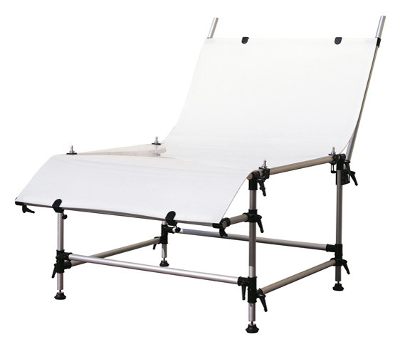 Mit Hilfe der mitgelieferten Klemmen (mit Spigot), können Sie an verschiedenen Stellen Dauerlichtlampen oder Studioblitze anbringen. Dies ermöglicht eine Belichtung auch von oben oder unten können, um schattenfreie Fotos von Glas, Kunststoff, Schmuck, Uhren, Keramik oder Elektronik machen zu können. Das Tischblatt lässt sich mit Hilfe von vier Klemmen befestigen.