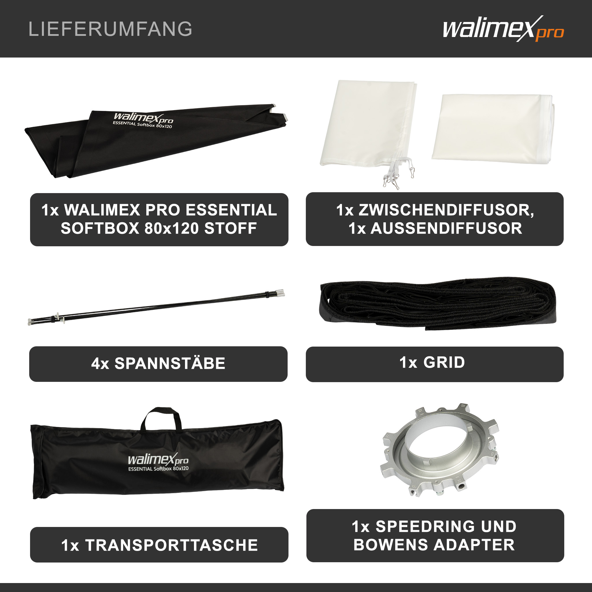 Die Walimex pro Essential-Softboxen überzeugen mit schneller Montage, hoher Materialqualität und vielseitigem Zubehör. Dank Bowens-Anschluss integrieren sie sich nahtlos in Ihr vorhandenes Kamera- und Fotozubehör. Jede Softbox enthält ein passendes Grid sowie eine praktische Tragetasche – ideal für flexible Lichtgestaltung in der professionellen Fotografie.