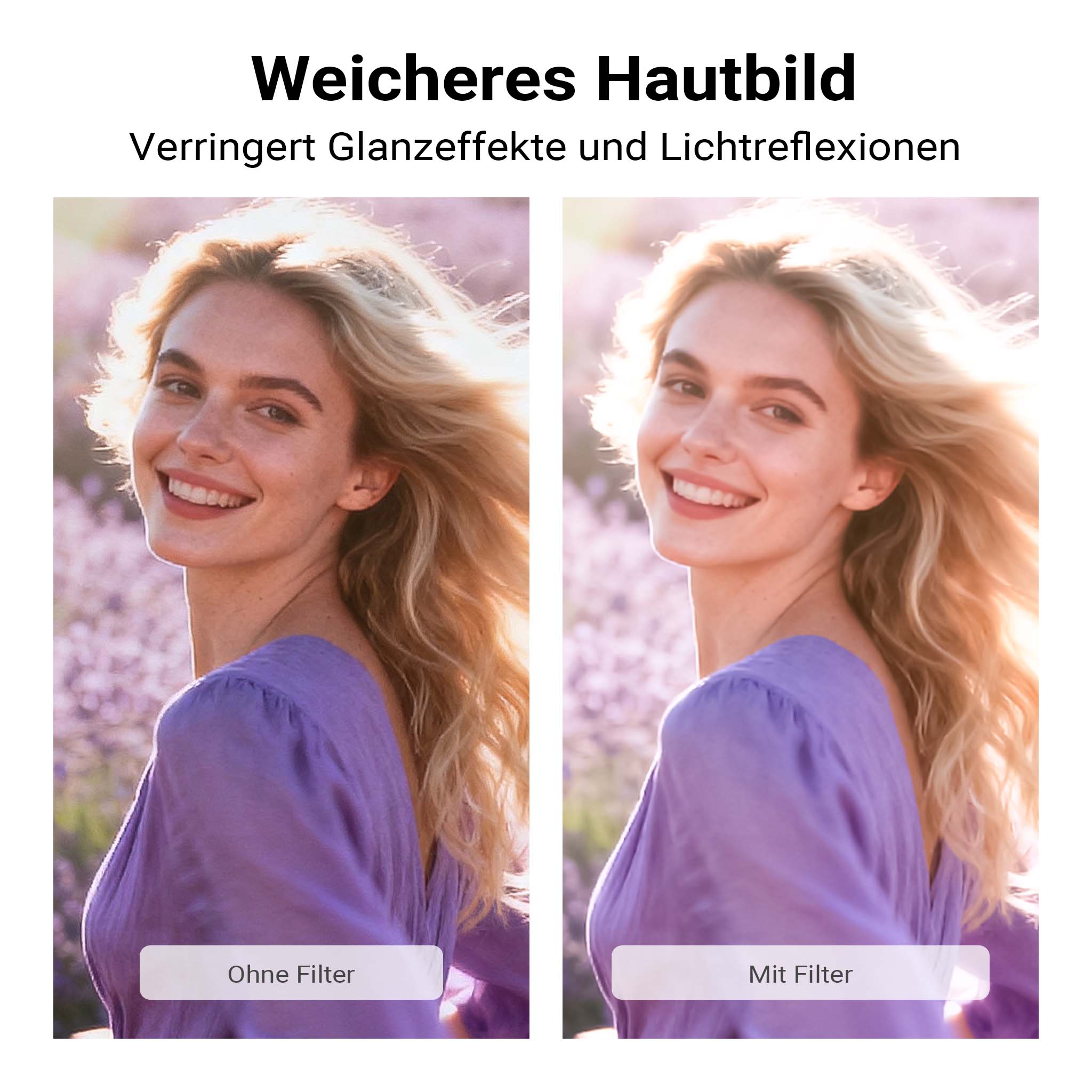 - [Vielseitige Einsatzbereiche] – Der Nebelfilter ist ideal für Videografie und Fotografie geeignet. Ob Musikvideos, Kurzfilme, Modeaufnahmen, Porträts oder romantische Hochzeitsbilder: Der Kamera Filter sorgt für schmeichelhafte Hauttöne, atmosphärische Lichtquellen mit Glow-Effekt und eine ästhetische Bildwirkung bei Tag, Nacht und Low-Light-Szenen.