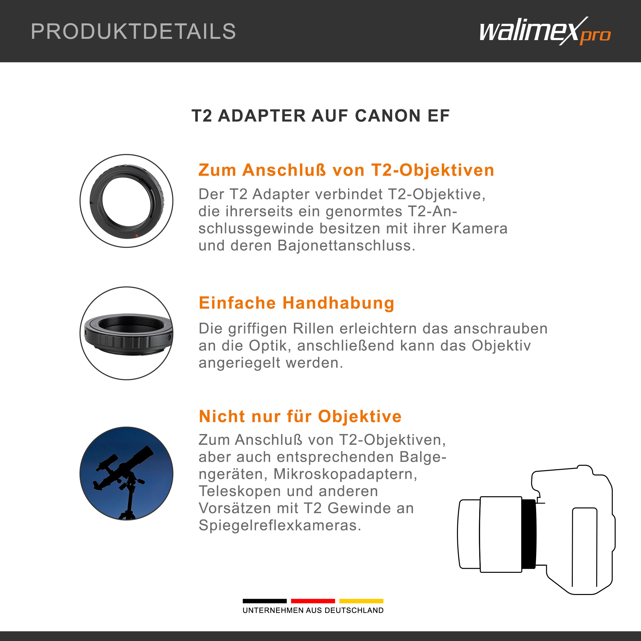 Der Adapter verbindet Objektive, die über ein genormtes T2-Anschlussgewinde verfügen, mit Ihrer Kamera und deren Bajonettanschluss. Er eignet sich auch für Fotozubehör wie Balgengeräte, Mikroskopadapter, Teleskope und andere Vorsätze mit T2-Gewinde. Der Adapter wird einfach auf das Kameraobjektiv bzw. Fotoobjektiv geschraubt und anschließend an der Kamera angebracht – für unkompliziertes Fotografieren mit Ihrer T2-Ausrüstung. Ob im Fotostudio oder unterwegs, Sie können Ihr Kameraobjektiv vielseitig einsetzen, Ihr Kamerazubehör erweitern und kreative Ergebnisse in der Fotografie erzielen.
