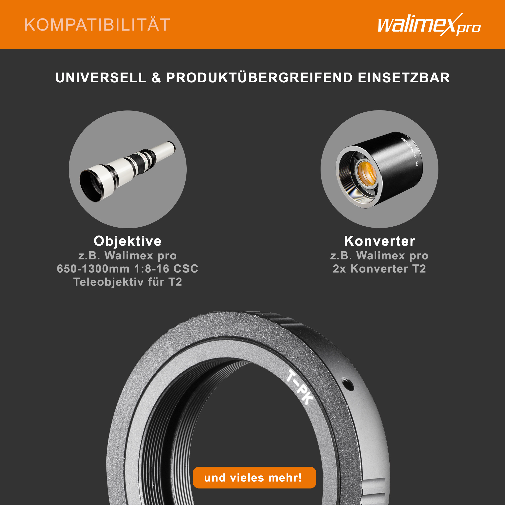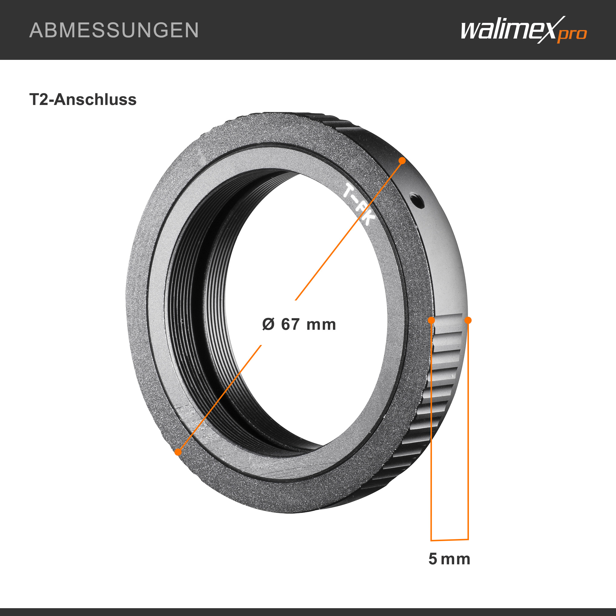 - [Adapter für T2-Objektive] – Der Walimex T2-Adapter ist ein hochwertiges Kamerazubehör, das die Nutzung von Objektiven mit T2-Anschluss an Kameras kompatibel mit Pentax K und kompatibel mit Samsung GX ermöglicht. Dank dem mechanischen Übergangsring ist eine zuverlässige Verbindung gewährleistet, so dass Fotografen kreative Freiheit mit manueller Steuerung von Zeit und Blende genießen können