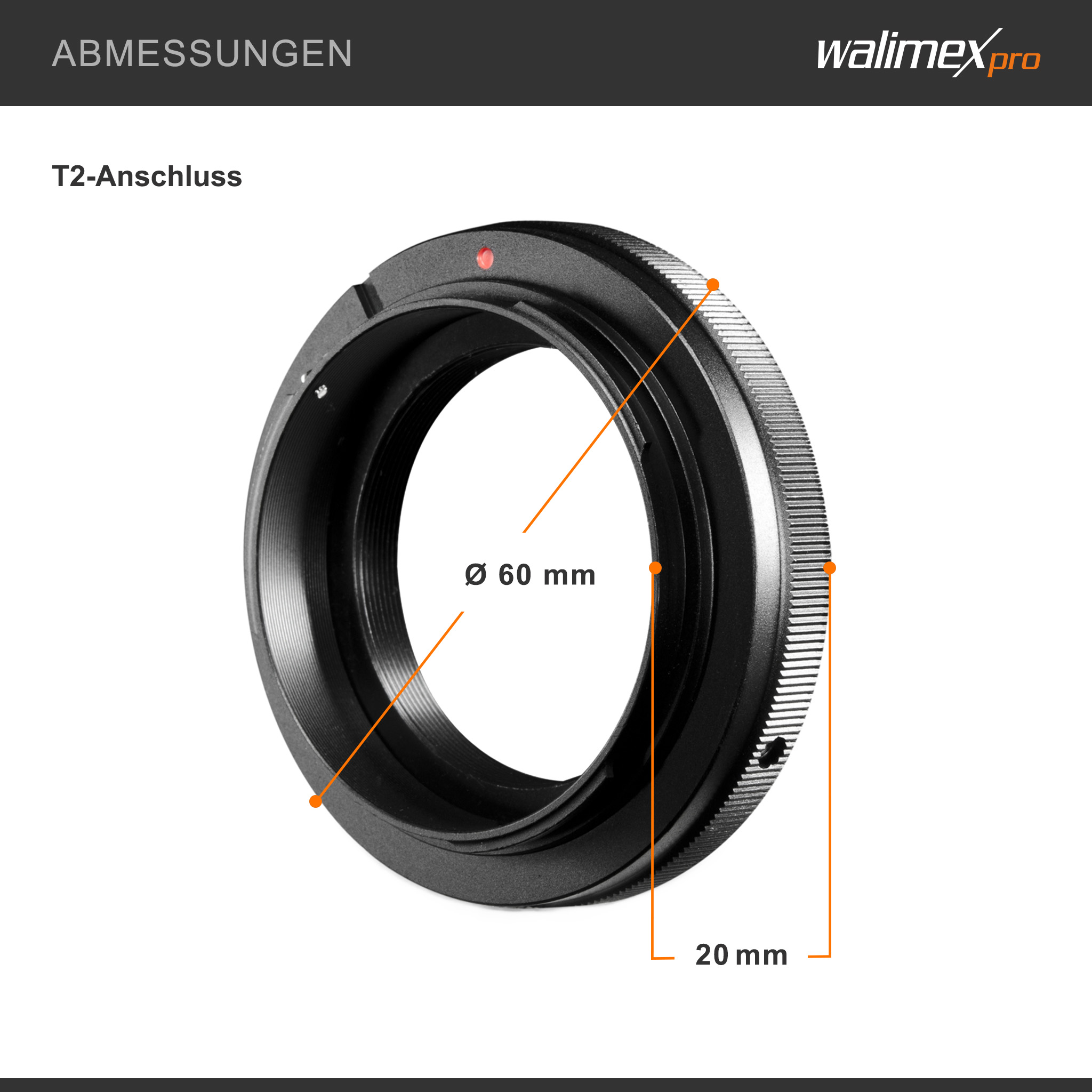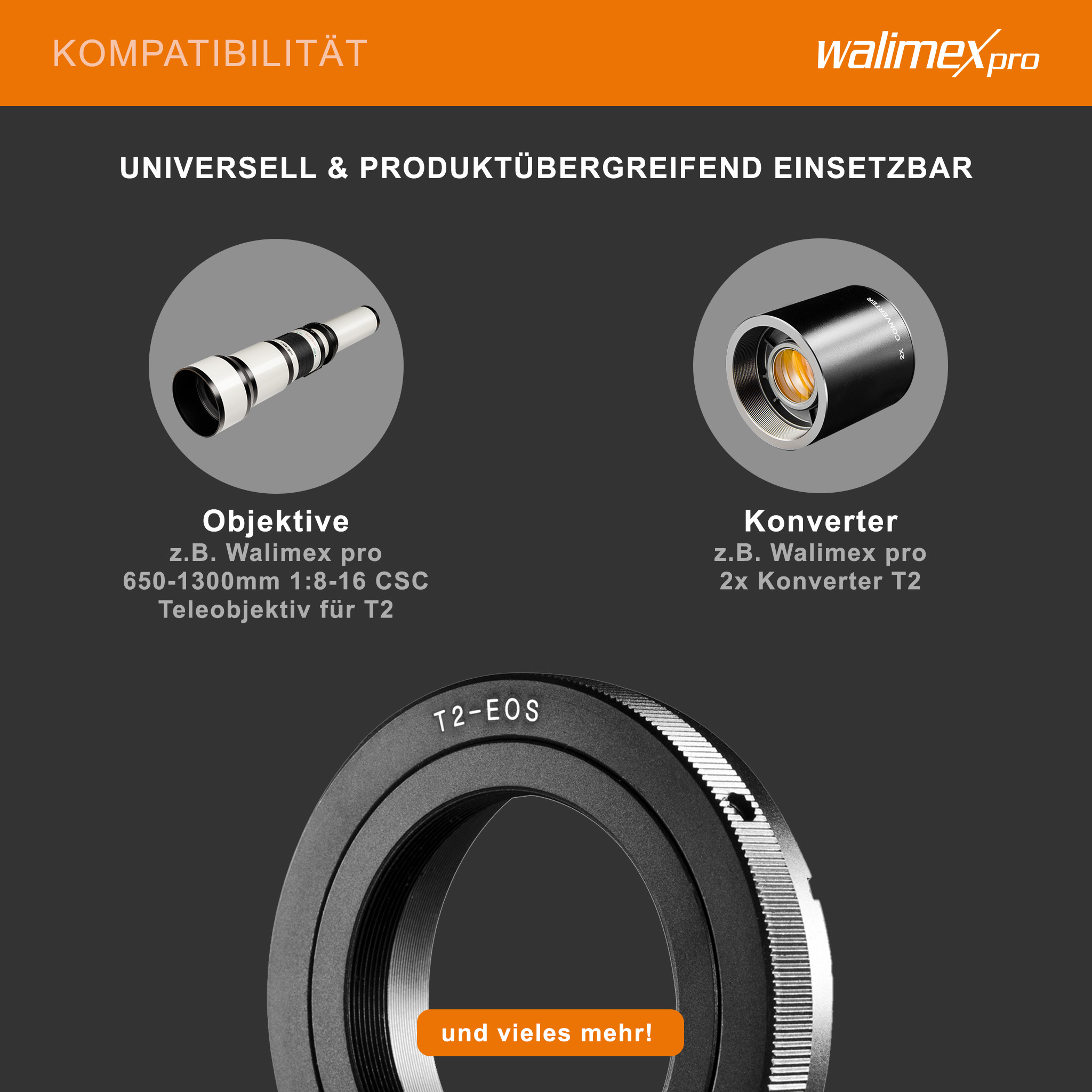 - [Adapter für T2-Objektive] – Der Walimex T2-Adapter ist ein hochwertiges Kamerazubehör, das die Nutzung von Objektiven mit T2-Anschluss an Kameras kompatibel mit Canon EF-Bajonett (EOS) ermöglicht. Dank dem mechanischen Übergangsring ist eine zuverlässige Verbindung gewährleistet, so dass Fotografen kreative Freiheit mit manueller Steuerung von Zeit und Blende genießen können