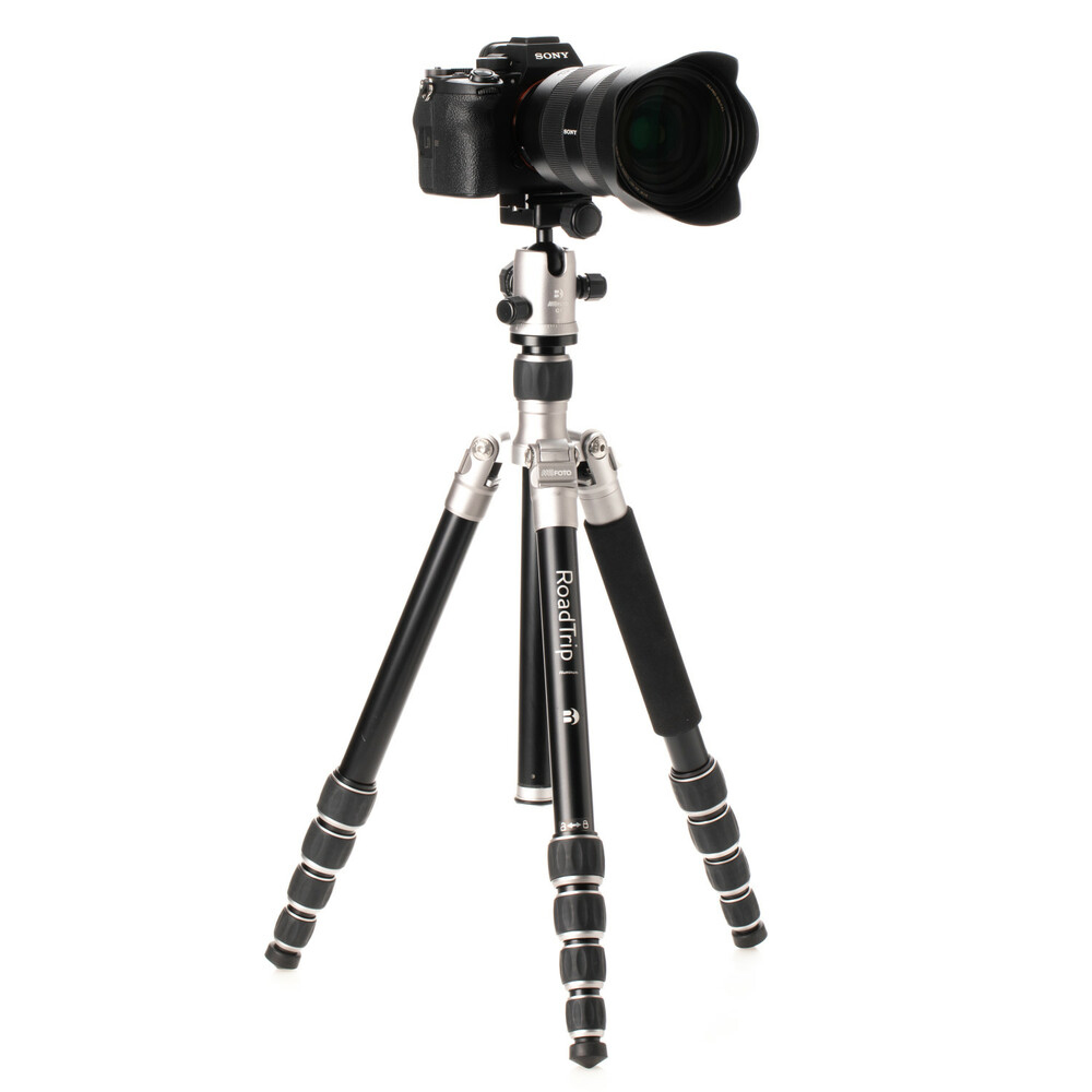 Der dreifach wirkende Q1-Kugelkopf verwendet eine Schnellwechselplatte im Arca-Swiss-Stil und verfügt über separate Bedienelemente für Schwenksperre, Zug und Friktion. Der RoadTrip ist ideal für Point & Shoot-, spiegellose, Micro 4/3- und DSLR-Kameras mit größeren Objektiven und kann bis zu 17,6 lb tragen: RoadTrip-Stativ, Q1-Kugelkopf, PU50-Kameraplatte, Stachelfüße und Tragetasche mit Schultergurt.
