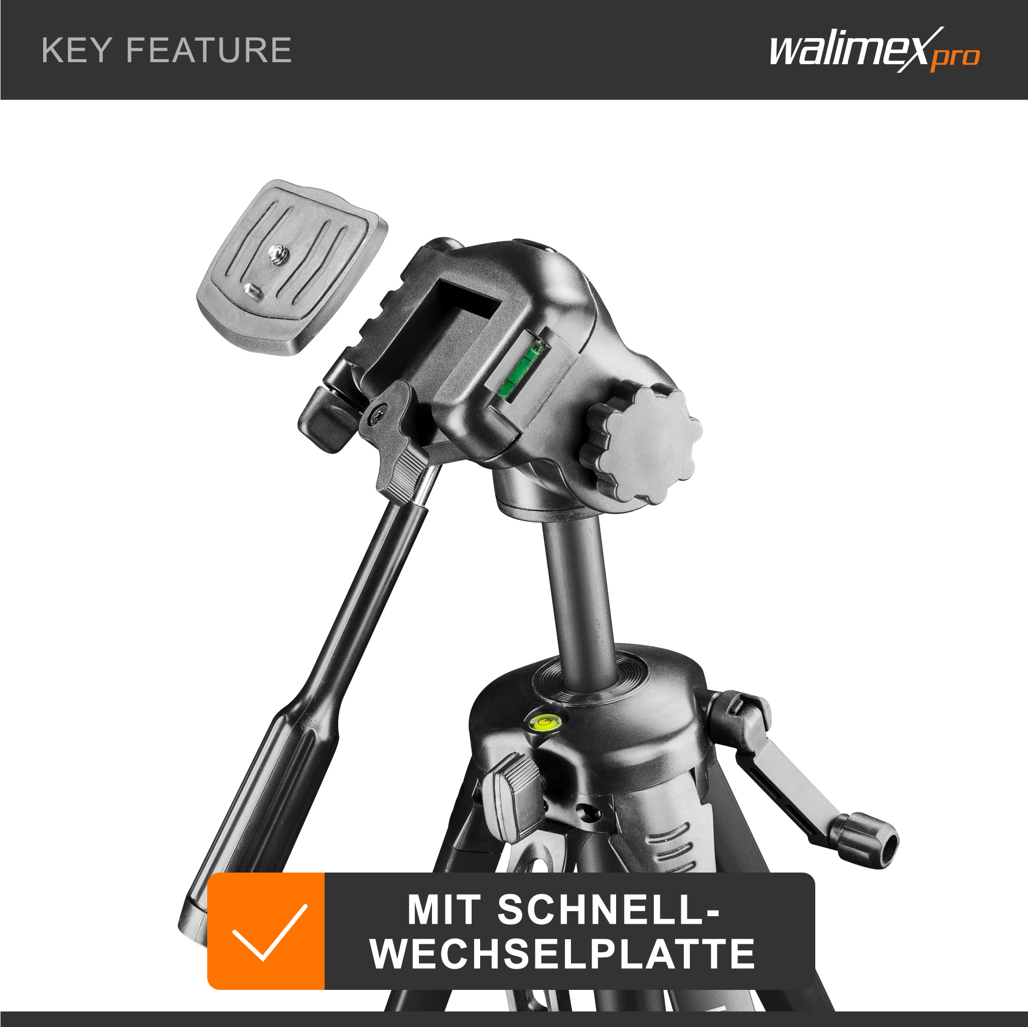 Das Walimex pro WT-3570 Stativ erlaubt durch eine Wasserwaage am Kopf und eine Libelle an der Stativschulter eine schnelle und exakte Ausrichtung. Ein Tragegriff an der Stativschulter sorgt zusätzlich für eine einfache und bequeme Handhabung des Statives. Das Stativ und der Neiger sind belastbar bis 4 kg und Ihr Equipment kann einfach und schnell per Schnellwechselplatte (75 x 55 mm) mit einem 1/4 Zoll Anschluss montiert werden - zusätzliche Schnellwechselplatten können separat erworben werden.