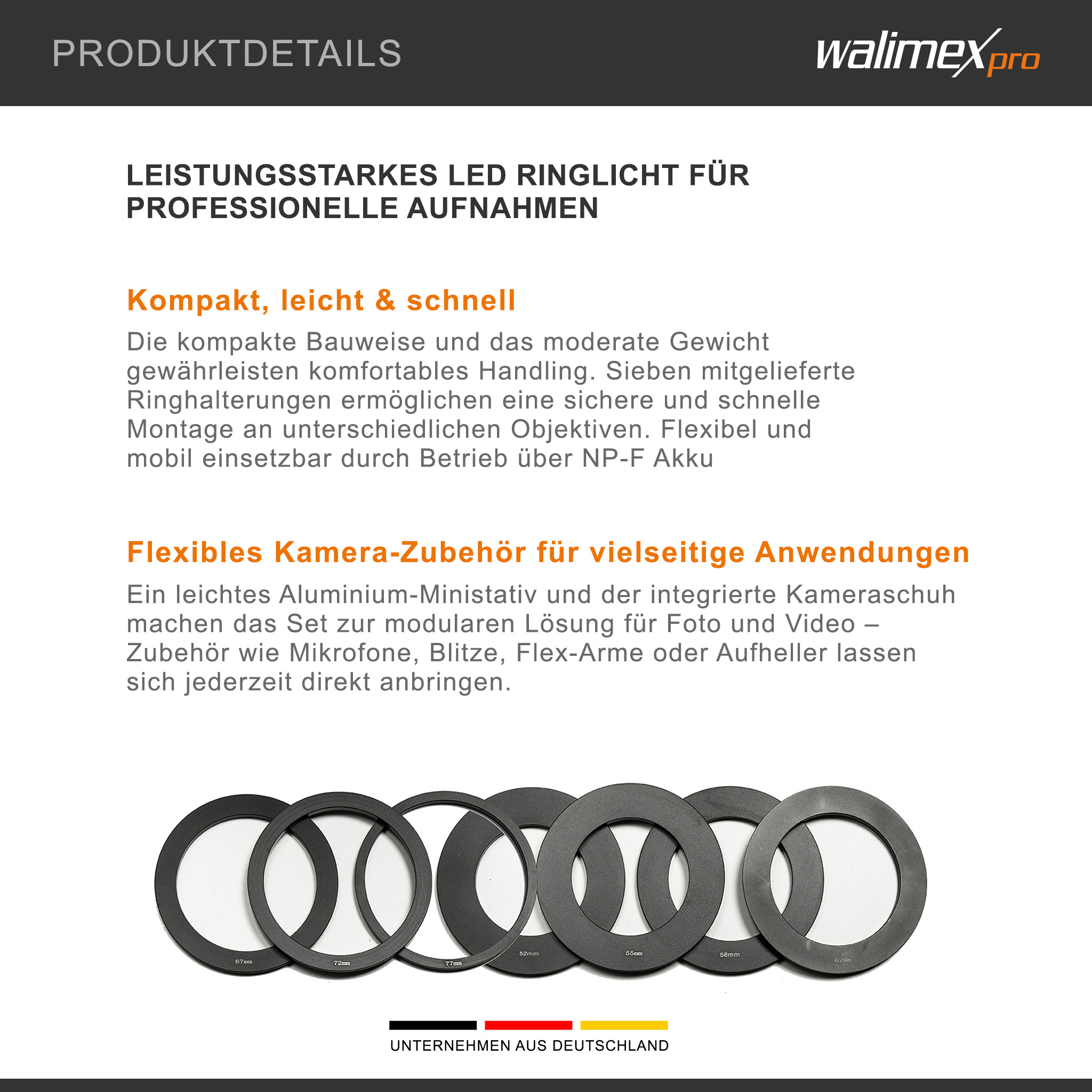- [Kompaktes Kamera Licht] – Die leichte, kompakte Bauweise ermöglicht komfortables Handling ohne Beeinträchtigung der Kameraführung. Perfekt für mobile Einsätze und Langzeitaufnahmen. Inklusive sieben Ringhalterungen zur einfachen Anpassung an verschiedene Objektive für vielseitige Einsatzmöglichkeiten.