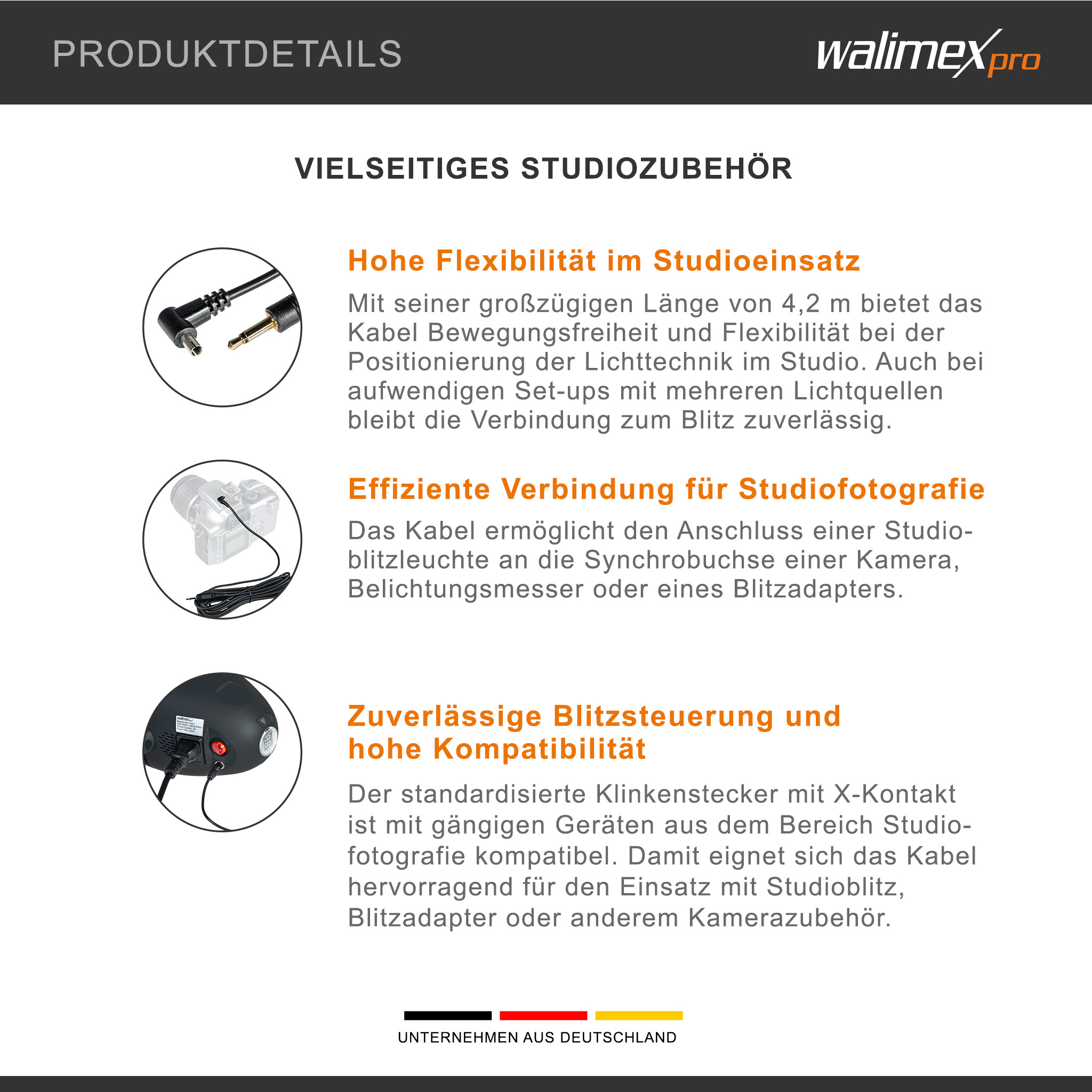 - [Bewegungsfreiheit] – Mit einer Länge von 4,2 m bietet das Synchronkabel ausreichend Flexibilität im Studioalltag und ermöglicht kreatives Arbeiten bei komplexen Setups mit mehreren Lichtquellen wie Studioblitz, Blitzlampe oder weiteren Kamera-Zubehörkomponenten