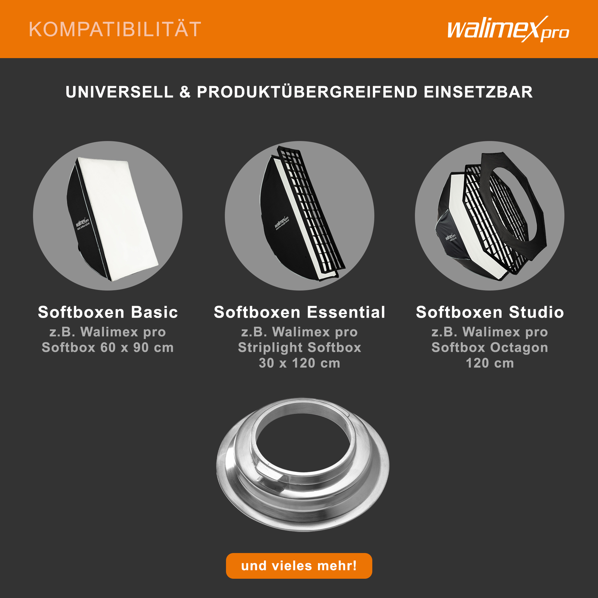 - [Kompatibilität] – Verbinden Sie Softboxen, Octagons und Striplights der Marke Walimex mit Blitzgeräten, kompatibel mit Broncolor, dank dem Softboxadapter. für konsistentes Studiolicht in der Porträtfotografie, Produktfotografie und Softbox-Fotografie