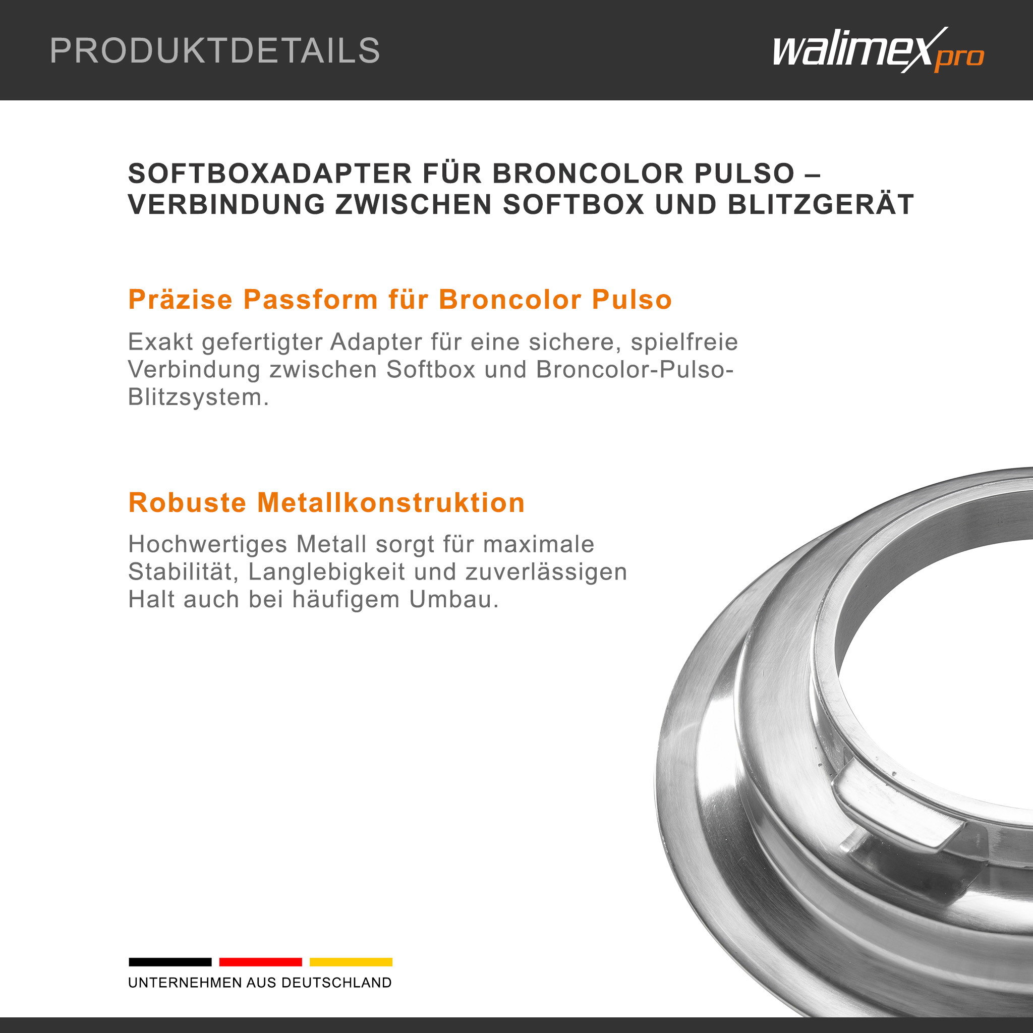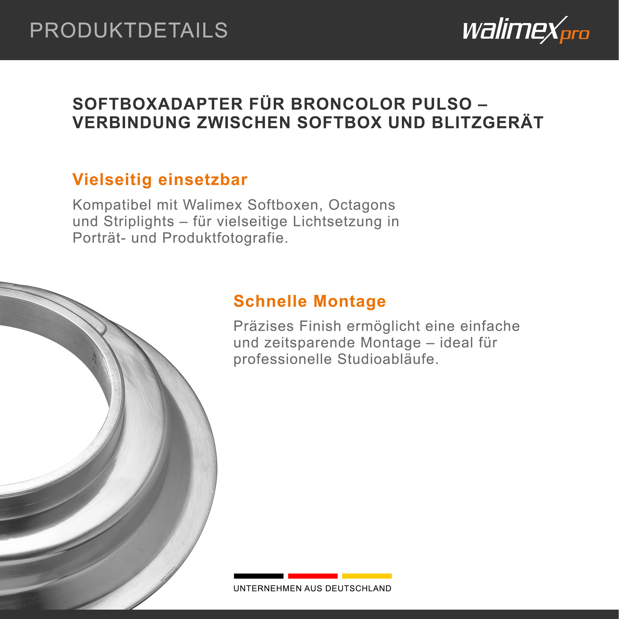 Der Adapter ist separat erhältlich und kompatibel mit Broncolor Pulso ausgelegt. Weitere Adaptervarianten für andere Hersteller sind verfügbar.