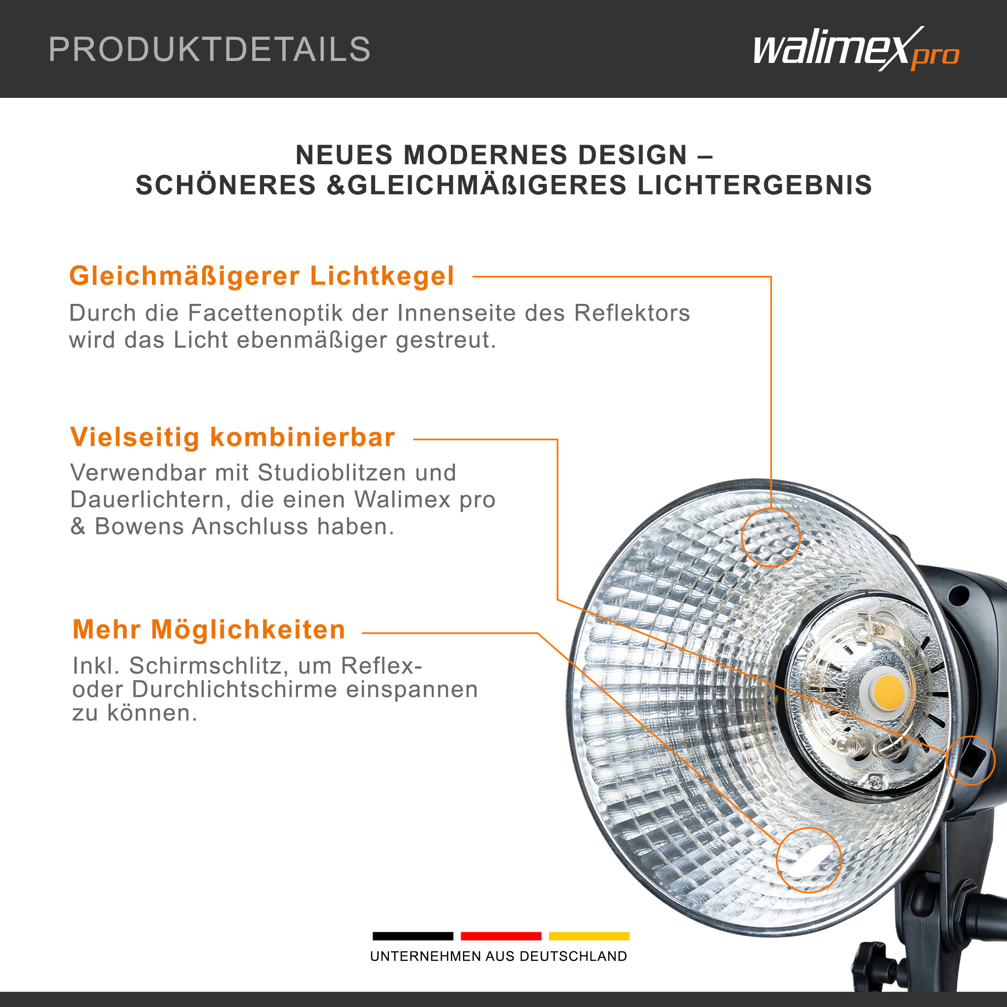 - [Standardreflektor Bowens-Anschluss] – Der Walimex pro Standardreflektor II ist mit einem Bowens- und Walimex pro-Anschluss ausgestattet und eignet sich für Studioblitze sowie Dauerlichter mit entsprechendem Bajonett. Er wird zur gezielten Lichtformung eingesetzt und erzeugt bewusst hartes Licht, das sich ideal für präzise Ausleuchtung und kontrollierte Lichtführung im Fotostudio eignet.
