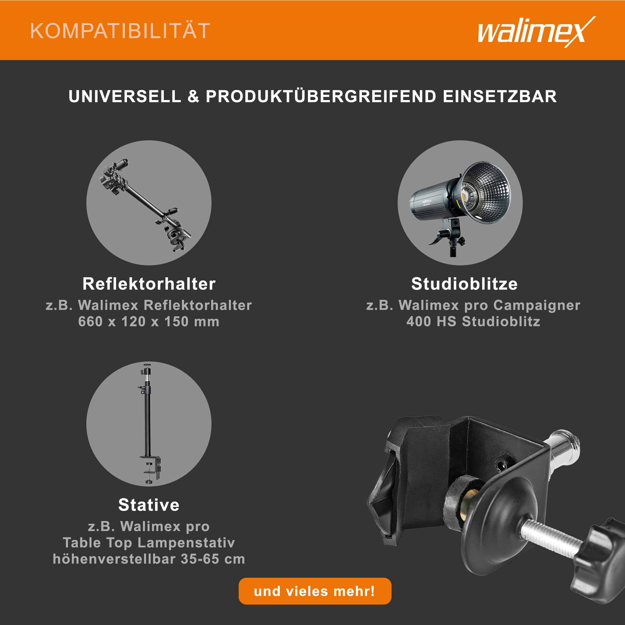 - [Studioeinsatz] – Die Studioklemme mit Spigot der Marke Walimex eignet sich ideal für professionelle Fotografie und den strukturierten Studioeinsatz mit Kamera-Zubehör aller Art. Sie ermöglicht eine zuverlässige Befestigung von Reflektorhaltern, Studioblitzen oder anderem Zubehör direkt an Fotostativ, Kamerastativ oder Aufnahmetisch