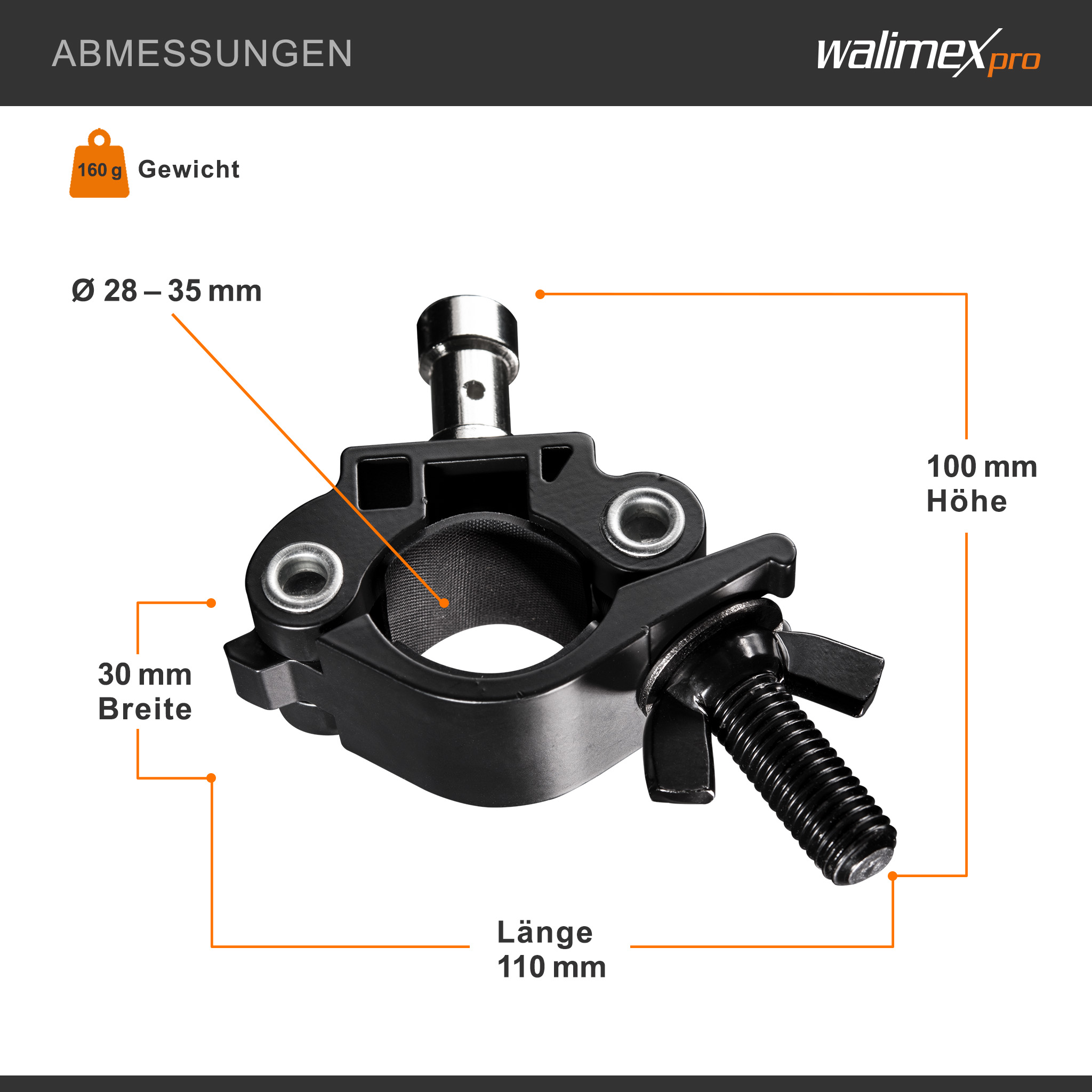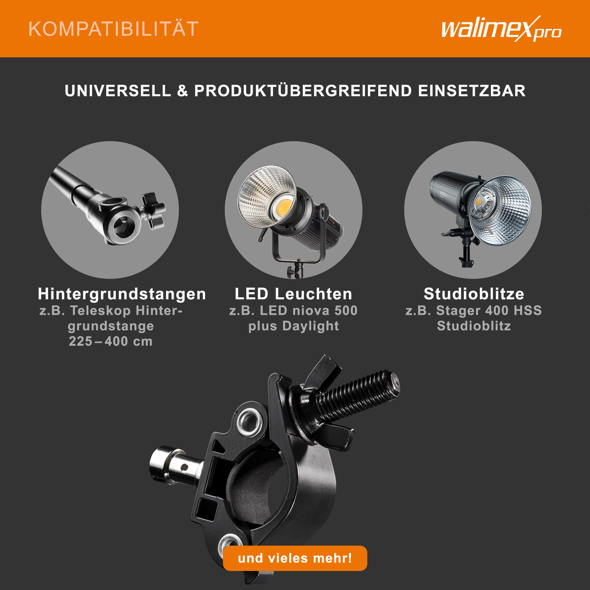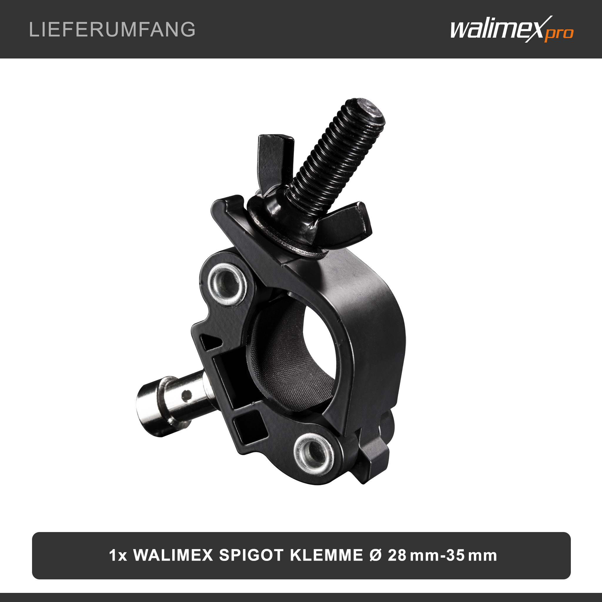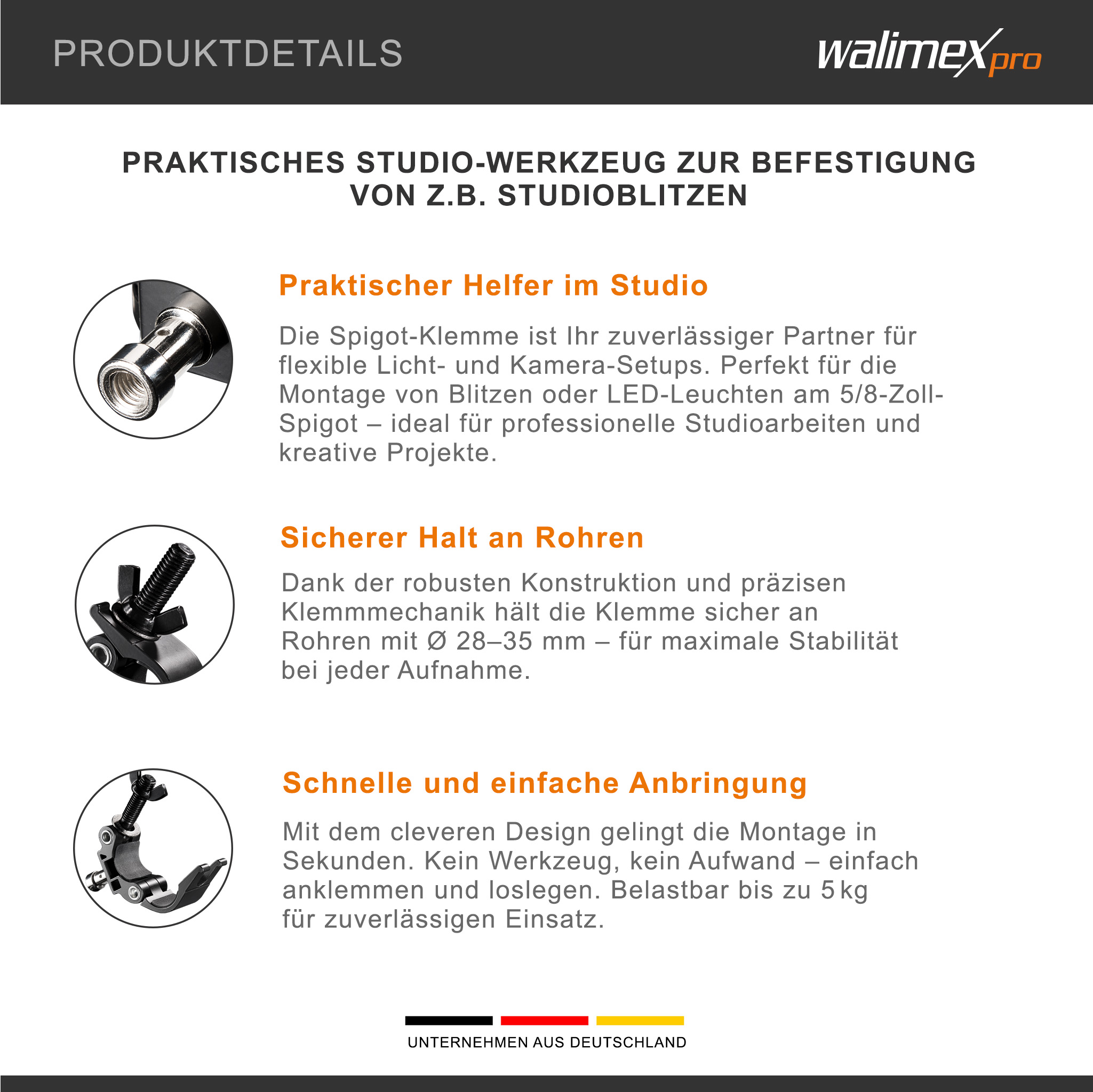 • Lieferumfang: 1x Walimex Spigot Klemme 28-35 mm Durchmesser