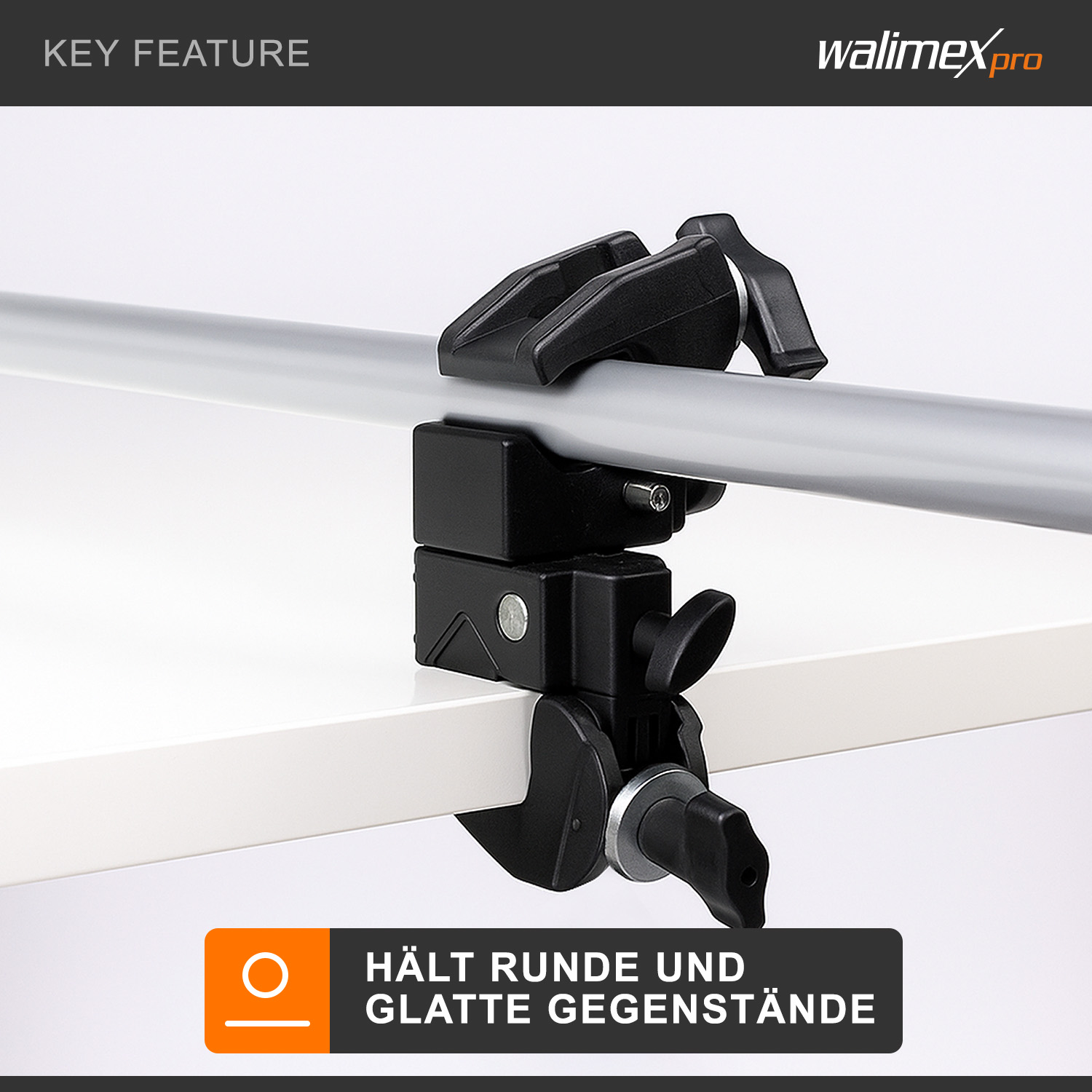 - [Flexible Anwendungsmöglichkeiten] – Die Doppel-Superklemme von Walimex eignet sich zur sicheren Montage verschiedenster Studioelemente wie Reflektoren, Halterungen oder Stangen an Stativen, Kanten, Auslegearmen oder Platten und bietet damit maximale Flexibilität für individuelle Setups in der professionellen Fotografie