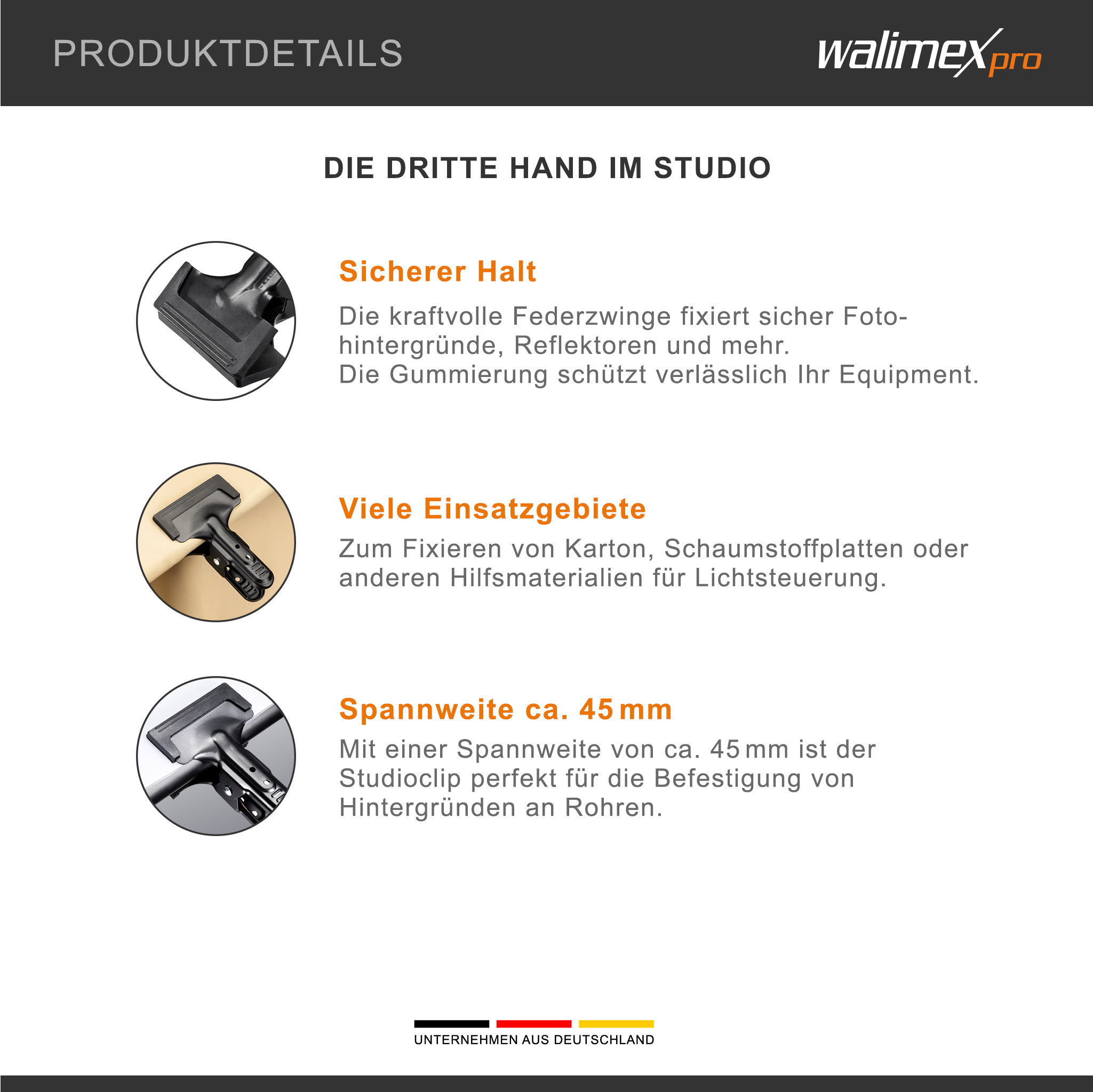 - [Unverzichtbares Kamerazubehör im Studio] – Durch seine stabile Ausführung und vielseitige Einsetzbarkeit gehört der Walimex Studioclip zur Grundausstattung im Studio ob für reflektor Fotografie als Ergänzung zum Fotohintergrund oder als Haken zum Klemmen überzeugt er durch Funktionalität und Zuverlässigkeit im täglichen Einsatz