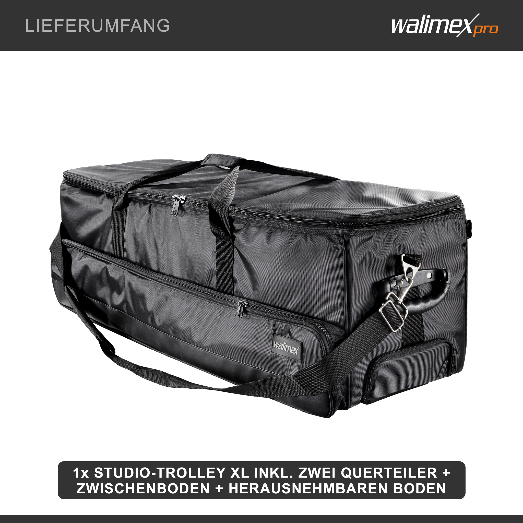 Dieser XL-Studio-Trolley der Marke Walimex pro wurde für den sicheren Transport umfangreicher Studioausrüstung entwickelt und bietet mit seinem großzügigen Stauraum die ideale Lösung für anspruchsvolle Fotografen und Fotografinnen. Die Tasche eignet sich für bis zu drei Blitzgeräte, drei Lampenstative, Softboxen, Reflexschirme sowie weiteres Kamera Zubehör. Dank variabler Inneneinteilung – bestehend aus zwei Querteilern, einem Zwischenboden und einem herausnehmbaren Boden – lässt sich der Innenraum individuell an das Equipment anpassen. Die gepolsterte Innenstruktur schützt empfindliche Technik zuverlässig und sorgt gleichzeitig für Ordnung beim mobilen Einsatz.