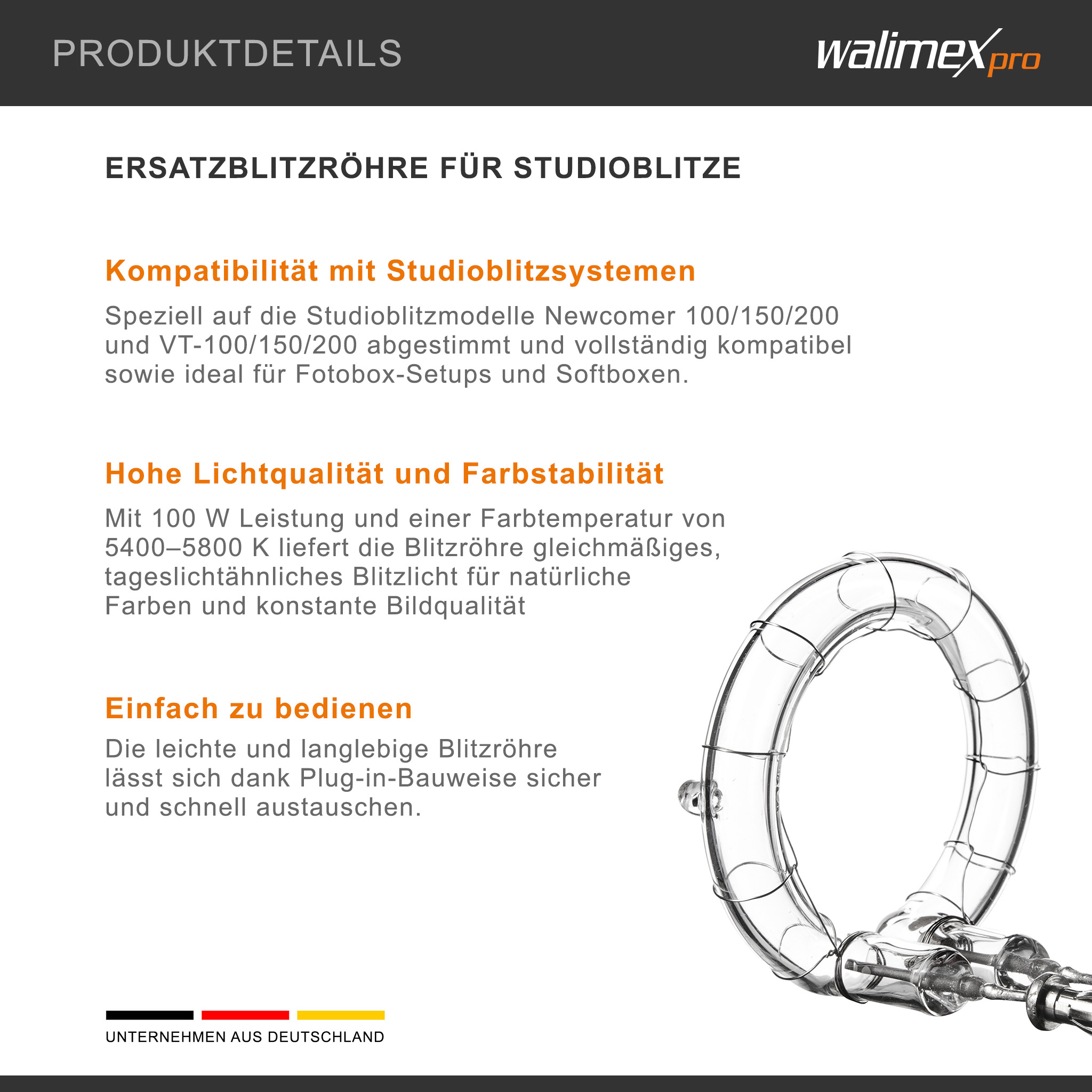 - [Walimex pro Ersatzblitzröhre] – Diese Ersatzblitzröhre von Walimex pro ist ein wichtiges Zubehör für Fotografen, die konstante Lichtqualität und verlässliche Leistung benötigen. Mit 100 W unterstützt sie professionelle Studioarbeit zuverlässig. Dank der Plug-in-Bauweise bleibt Ihr Studioblitz oder Ihre Blitzanlage ohne lange Unterbrechungen einsatzbereit.