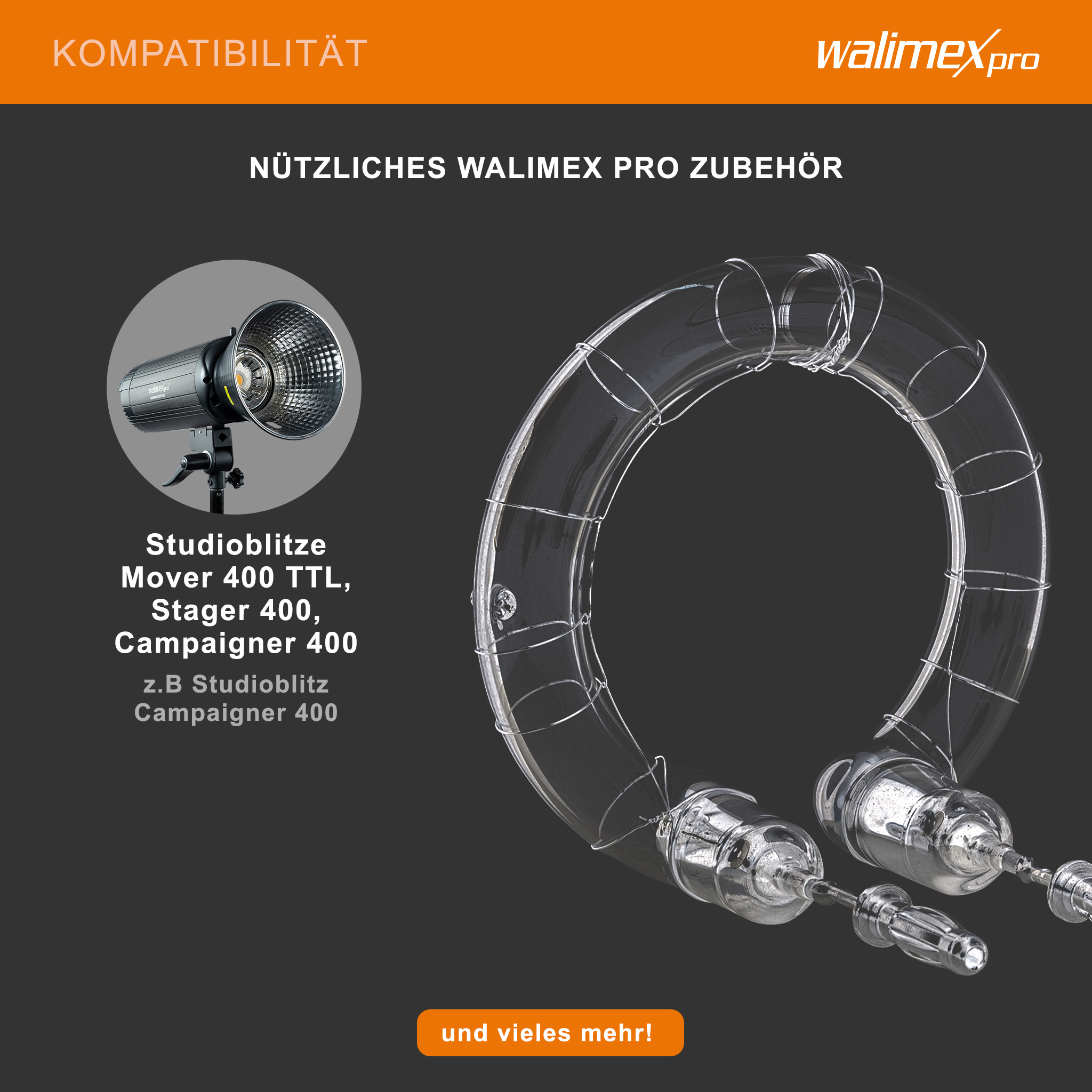 Die leicht zu wechselnde Plug-in-Blitzröhre hat eine Leistungsaufnahme von 400 W und eine Lebensdauer von etwa 10.000 Auslösungen. Sie hat eine Farbtemperatur von 5400–5800 K und ist kompatibel mit Walimex pro Studio Akkublitz Mover 400 TTL, Stager 400 und Campaigner 400.