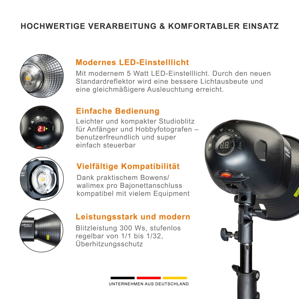 Der Blitz hat ein modernes 5 Watt LED-Einstelllicht. Die Blitzleistung von 300 Watt ist stufenlos regelbar von 1/1 bis 1/32. Durch die hohe Lichtausbeute eignet sich der Blitz ideal für kleinere Studios und leuchtet hierbei Studiofotos einfach und professionell aus.