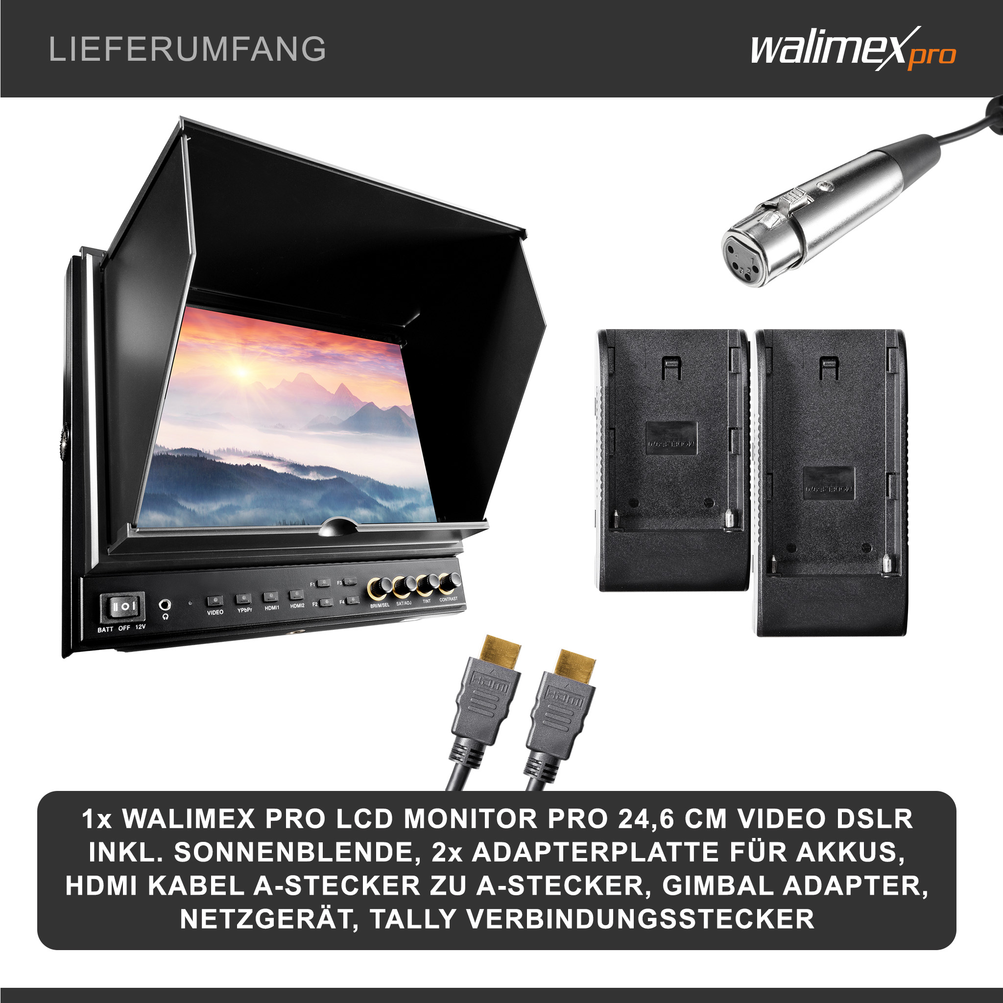 - [Professionelle Bildkontrolle] – Der Walimex pro LCD Monitor unterstützt Sie zuverlässig bei der Bildkontrolle beim Filmen mit DSLR- und Videokameras. Dank hoher Helligkeit, starkem Kontrast und optionaler Sonnenblende bleibt das Display auch bei direktem Sonnenlicht gut ablesbar. Der große Betrachtungswinkel ermöglicht mehreren Personen gleichzeitig eine klare Sicht auf das Kamerabild.