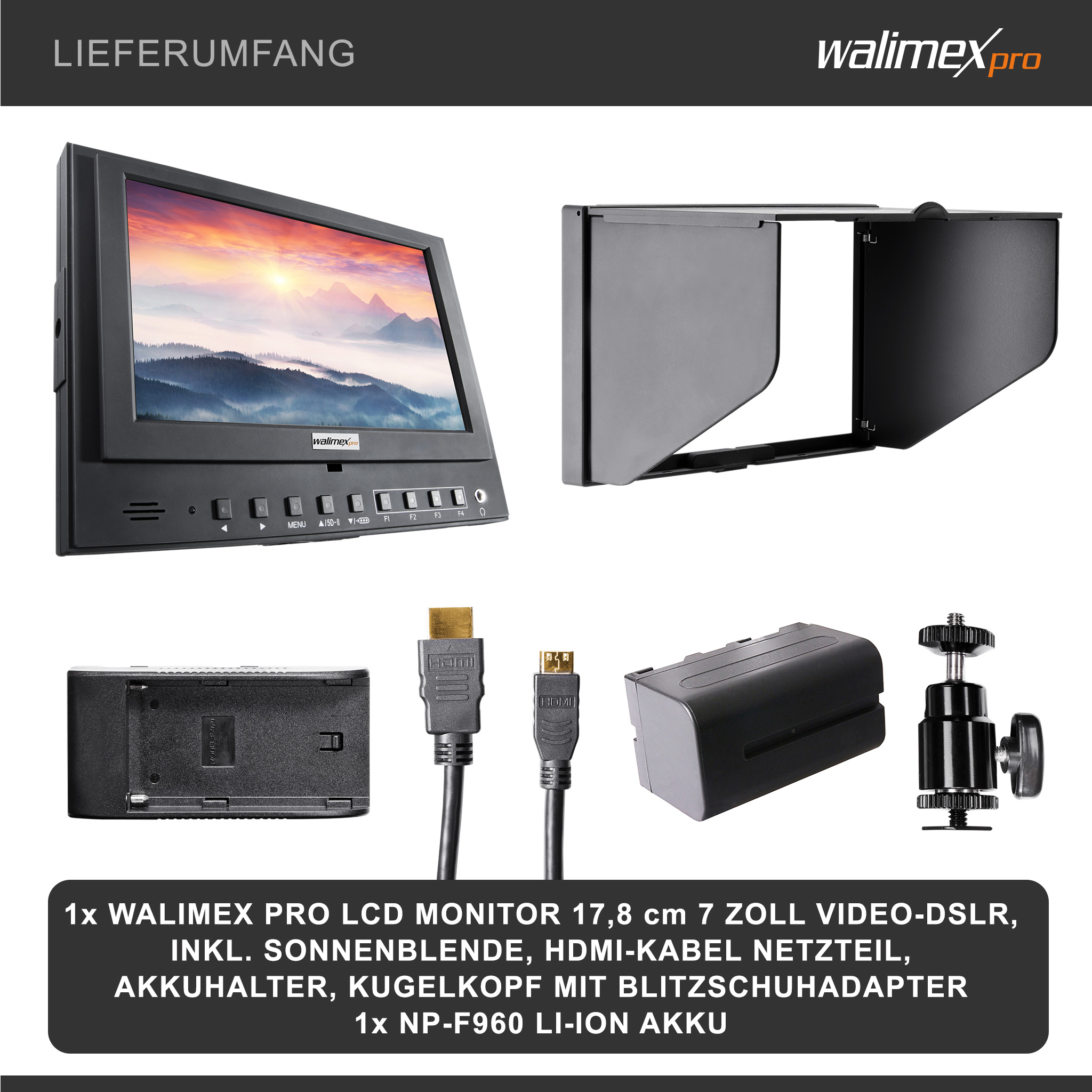 - 1x Walimex pro LCD Monitor 17,8 cm 7 Zoll Video-DSLR, inkl. Sonnenblende, HDMI-Kabel-Netzteil, Akkuhalter, Kugelkopf mit Blitzschuhadapter